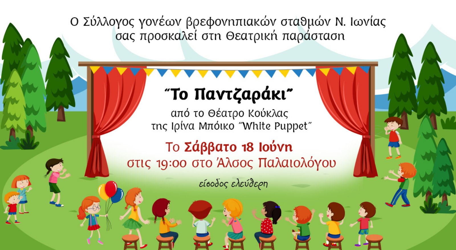 Ο Σύλλογος γονέων βρεφονηπιακών σταθμών Ν. Ιωνίας ανεβάζει τη θεατρική παράσταση “Το Παντζαράκι” από το θέατρο κούκλας της Ιρίνας Μπόικο “White Puppet”. Η εκδήλωση θα πραγματοποιηθεί το Σάββατο 18 Ιουνίου στις 19:00 στο Άλσος Παλαιολόγου.Η είσοδος θα είναι ελεύθερη για όλους.