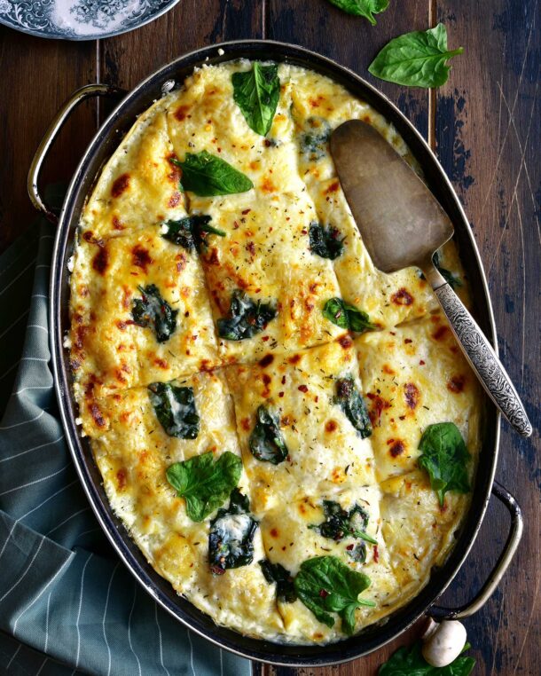 - Απλώνουμε ομοιόμορφα την υπόλοιπη μπεσαμέλ, σκορπίζουμε την γραβιέρα και ψήνουμε για περίπου 35 λεπτά ή μέχρι να μαλακώσουν τα ζυμαρικά και να ροδίσει η μπεσαμέλ.