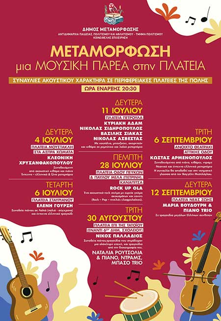H τρίτη κατά σειρά συναυλία της ιδιαίτερης δράσης με τις «Ακουστικού Χαρακτήρα Συναυλίες στις Περιφερειακές Πλατείες» της Μεταμόρφωσης, «για να θυμηθούμε ξανά τις εποχές που η συνάντηση γινόταν παρέα, η κουβεντούλα τραγούδι και το τραγούδι συγκίνηση», όπως αναφέρει ο Δήμος, πραγματοποιείται τη Δευτέρα 11/7/2022, στις 20.30, στην πλατεία Σ. Πέτρουλα (Σ. Πέτρουλα & Αντιγόνης).