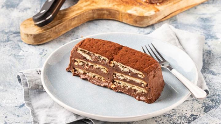 Τοποθετούμε ένα στρώμα από μπισκότα στον πάτο της φόρμας και καλύπτουμε με αρκετό από το μείγμα πραλίνας, απλώνοντάς το ομοιόμορφα πάνω από τα μπισκότα. Επαναλαμβάνουμε την ίδια διαδικασία, μέχρι να γεμίσει η φόρμα, τελειώνοντας με ένα στρώμα από το μείγμα πραλίνας.
