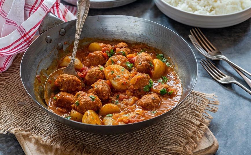 Λουκάνικα και πατάτες με σάλτσα κάρι