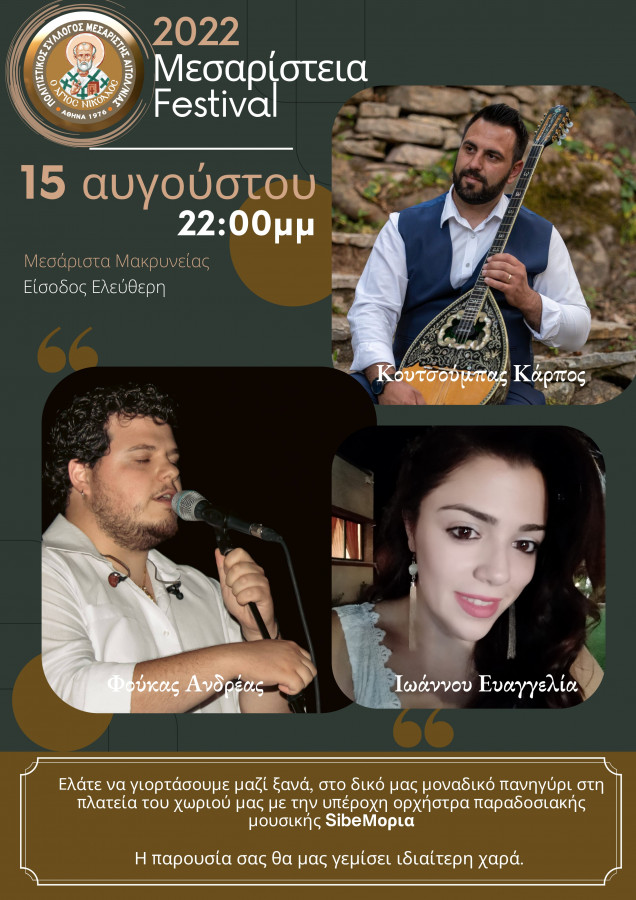 Τα «ΜΕΣΑΡΙΣΤΕΙΑ 2022» ανοίγουν σε λίγες ημέρες τις πύλες τους. Μια εκδήλωση που στήνεται εδώ και μήνες, γίνεται στις 15 Αυγούστου 2022 και ώρα 22:00μμ πραγματικότητα. Πού; Που αλλού στην γραφική πλατεία του χωριού μας στη Μεσάριστα Μακρυνείας Αιτωλοακαρνανίας.