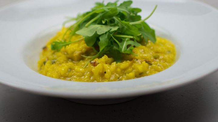 Αφαιρέστε από τη φωτιά και μετά ανακατέψτε καλά προσθέτοντας βούτυρο. Στη συνέχεια προσθέστε την παρμεζάνα και καλύψτε. Αφήστε το να ξεκουραστεί για 2 λεπτά. Προσθέστε το υπόλοιπο σαφράν, σερβίρετε και απολαύστε.