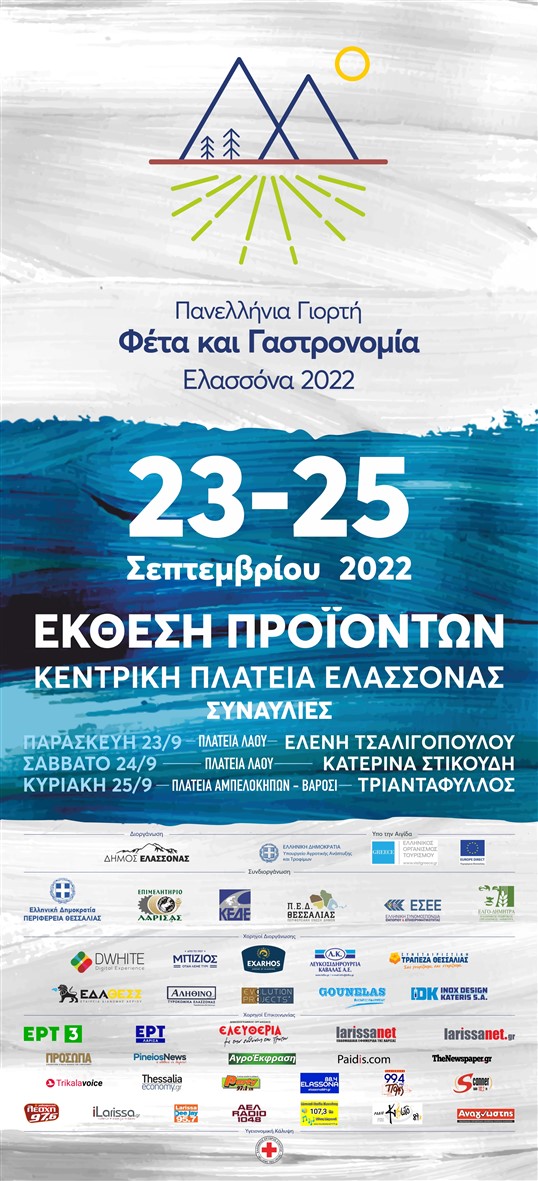 Με το σύνθημα «Δώσε αίμα – Χάρισε το δώρο της ζωής» ξεκινάει η Πανελλήνια Γιορτή «ΦΕΤΑ & ΓΑΣΤΡΟΝΟΜΙΑ, ΕΛΑΣΣΟΝΑ 2022» η οποία διοργανώνεται από το Δήμο Ελασσόνας και το τμήμα αιμοδοσίας του Γενικού Νοσοκομείου Λάρισας.