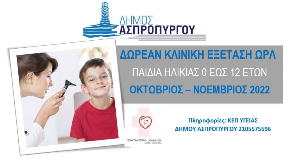 Ο Δήμος Ασπροπύργου ανακοίνωσε με ιδιαίτερη ικανοποίηση τη συνεργασία του με το ΠΟΛΥΙΑΤΡΙΚΟ ΙΑΤΡΙΚΗ ΕΠΕ, για την δωρεάν κλινική εξέταση ΩΡΛ που θα πραγματοποιείται πλέον σε όλα τα παιδιά των σχολείων της πόλης, ηλικίας έως και 12 ετών, τους μήνες Οκτώβριο και Νοέμβριο 2022. Την πρωτοβουλία της συνεργασίας είχε ο Αντιδήμαρχος Διοικητικών και Οικονομικών Υπηρεσιών, κ. Αντώνιος Καραμπούλας, εξασφαλίζοντας μία ιδιαίτερα σημαντική κοινωνική παροχή υγείας για τα παιδιά και τις οικογένειές τους.