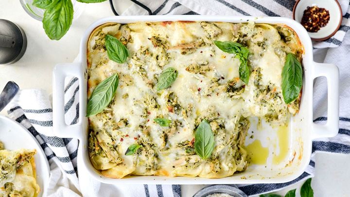 Βάλτε το 1/3 του μείγματος πέστο δεν ένα μικρό ταψάκι. Βάλτε από πάνω 4 λαζάνια, επαναλάβετε με 2 στρώσεις σάλτσας και λαζάνια και τελειώστε με λαζάνια. Βάλτε γάλα στο υπόλοιπο μασκαρπόνε, αλατοπίπερο και χύστε το πάνω από τα λαζάνια. Ρίξτε την παρμεζάνα και το κουκουνάρι και ψήστε για 35-40 λεπτά. Σερβίρετε με σαλάτα.