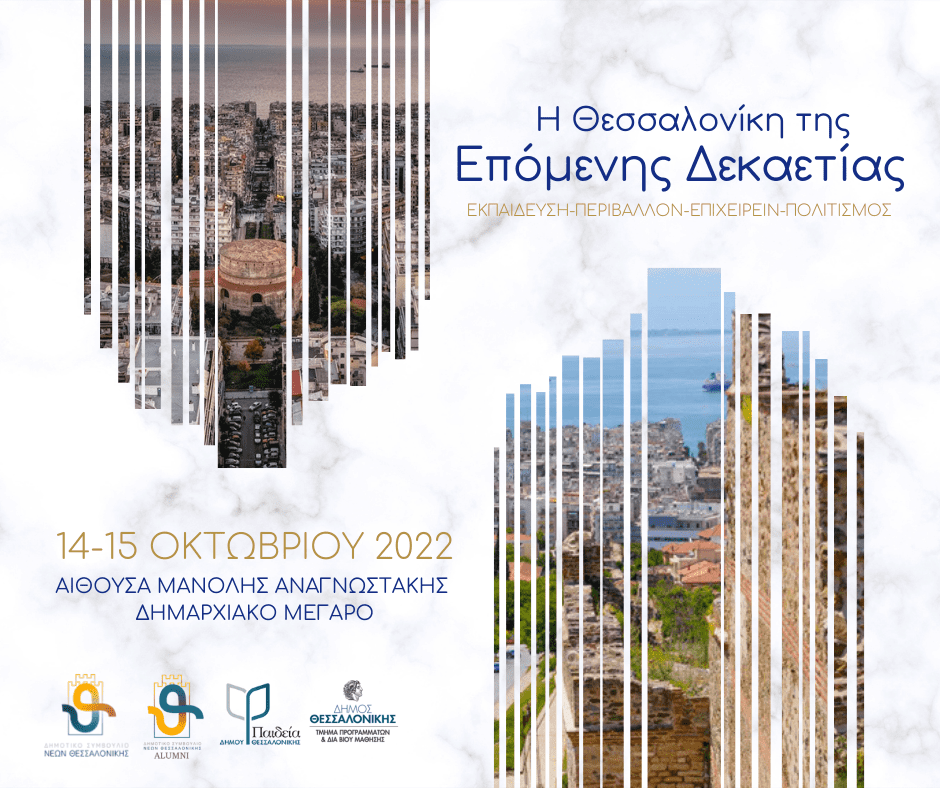 Στην ευρύτερη προσπάθεια για την ανάδειξη σημαντικών ζητημάτων για την πόλη, την βιωσιμότητα και την κοινωνική συνοχή της, το Δημοτικό Συμβούλιο Νέων Θεσσαλονίκης και οι Alumni του Δημοτικού Συμβουλίου Νέων Θεσσαλονίκης διοργανώνουν σε συνεργασία με το τμήμα Προγραμμάτων και Δια Βίου Μάθησης της Αντιδημαρχίας Παιδείας του Δήμου Θεσσαλονίκης διημερίδα με τίτλο: «Η Θεσσαλονίκη της επόμενης δεκαετίας: Άξονες Ανάπτυξης: Εκπαίδευση, Περιβάλλον, Πολιτισμός και Επιχειρηματικότητα».