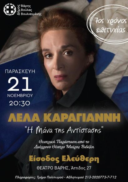 Τη θεατρική παράσταση Λέλα Καραγιάννη, «Η Μάνα της Αντίστασης» παρουσιάζει ο Δήμος Βάρης Βούλας Βουλιαγμένης την Παρασκευή 21 Νοεμβρίου 2022 στις 20:30, στο Δημοτικό Θέατρο Βάρης (Άττιδος 27 – Βάρη). Το Διάχρονο Θέατρο, της Μαίρης Βιδάλη, παρουσιάζει για 7η χρονιά το έργο – μονόλογο του Γιώργου Α. Χριστοδούλου με την Μαίρη Βιδάλη, στον ομώνυμο ρόλο.