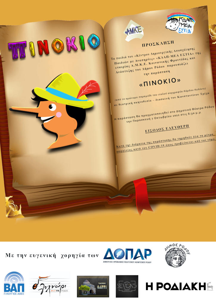 Την παιδική θεατρική παράσταση «ΠΙΝΟΚΙΟ» από το ομώνυμο παραμύθι του Ιταλού λογοτέχνη Κάρλο Κολόντι, παρουσιάζουν την Παρασκευή 7 Οκτωβρίου στις 6:30 μ.μ. στο Δημοτικό Θέατρο Ρόδου τα παιδιά του Κέντρου Δημιουργικής Απασχόλησης Ατόμων με αναπηρία (ΚΔΑΠ ΜεΑ) «ΕΣΤΙΑ» της εταιρίας ΑΜΚΕ Κοινωνικής Φροντίδας και Ανάπτυξης του Δήμου Ρόδου.