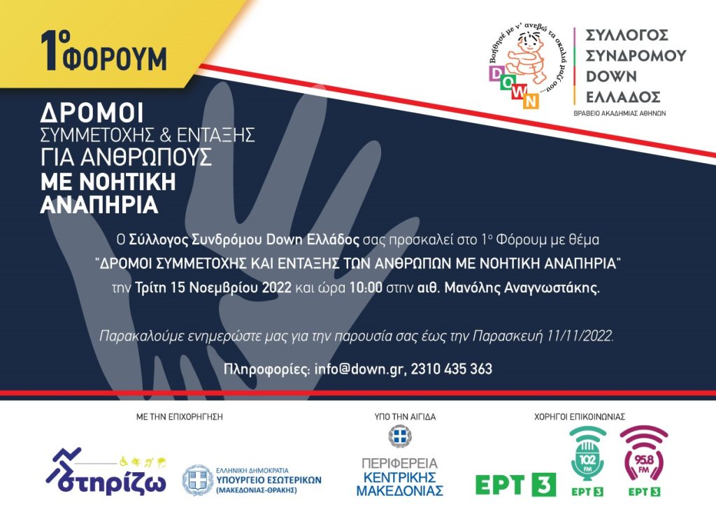 News ΑΜΕΑΚεντρικήΠρόσκληση – 1ο Φόρουμ Συλ. Συνδ. Down Ελλάδος by xristiana4 Νοεμβρίου 20224 Νοεμβρίου 20220478 Share00 4/11/2022