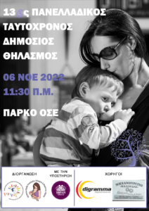 Στο πλαίσιο του εορτασμού της Παγκόσμιας Εβδομάδας Μητρικού Θηλασμού, το Πανελλήνιο Δίκτυο Εθελοντικών Ομάδων Υποστήριξης Μητρικού Θηλασμού και Μητρότητας, την Κυριακή 6 Νοεμβρίου 2022, διοργανώνει τον 13o Πανελλαδικό Ταυτόχρονο Δημόσιο Θηλασμό.