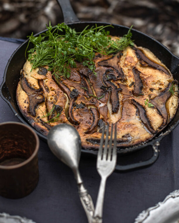 - Σκορπίζουμε τα μανιτάρια στον χυλό, μαζί με τα κομματάκια από το υπόλοιπο βούτυρο. Χτυπάμε σε ένα μπολάκι το τελευταίο αυγό και περιχύνουμε τον χυλό εδώ κι εκεί.