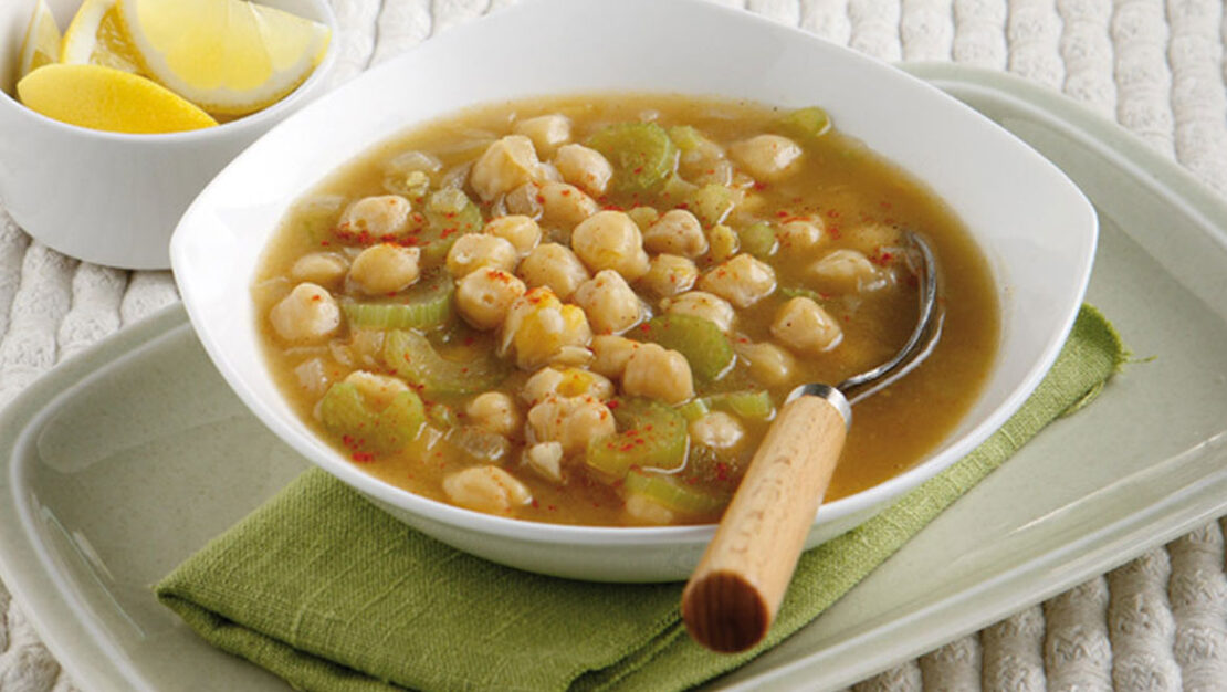 Στην ίδια κατσαρόλα ζεσταίνουμε το ελαιόλαδο. Αφού κάψει το λάδι, ρίχνουμε το σέλερι και το ψιλοκομμένο κρεμμύδι και τα σοτάρουμε για 5 λεπτά ρίχνοντας στο τέλος και τα μπαχαρικά. Προσθέτουμε τα ρεβίθια, ανακατεύοντας καλά και στη συνέχεια ρίχνουμε το ζουμί τους. Μόλις πάρουν βράση χαμηλώνουμε τη φωτιά. Αφήνουμε τη σούπα να σιγοβράσει για 20 λεπτά, ανακατεύουμε με το χυμό λεμονιού και τη σερβίρουμε ζεστή.