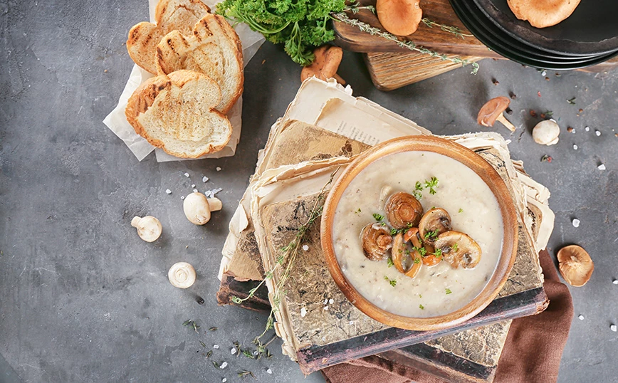 Αφαιρέστε και πετάξτε το φύλλο δάφνης, στη συνέχεια, αφαιρέστε το μείγμα μανιταριών από τη φωτιά και χτυπήστε το με ένα μπλέντερ χειρός μέχρι να γίνει λείο.