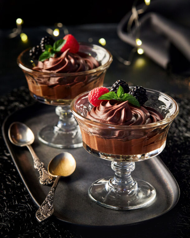 8. Διακοσμούμε, τη μους σοκολάτας, με τα φρέσκα φρούτα του δάσους και τα φύλλα μέντας ή δυόσμου.