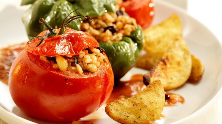 - Κόβετε από μια οριζόντια φέτα στο πάνω μέρος κάθε ντομάτας και κάθε πιπεριάς και τις κρατάτε για καπάκια. Αδειάζετε την ψίχα από τις ντομάτες, την ψιλοκόβετε και την κρατάτε μαζί με τους χυμούς της. Τοποθετείτε τις ντομάτες με το άνοιγμα προς τα κάτω για να στραγγίξουν. Αφαιρείτε τους σπόρους και τις ίνες από τις πιπεριές.