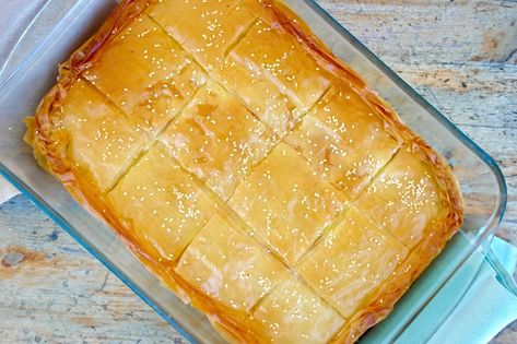 - Ραντίζετε τα φύλλα με λίγο νερό με τα δάχτυλά σας και ψήνετε τη πίτα σας σε προθερμασμένο στους 180 βαθμούς φούρνο για 50-60 λ ή μέχρι να ροδίσει καλά η επιφάνειά της. Τη βράζετε την αφήνετε για κρυώσει τόσο όσο να μπορείτε να τη κόψετε και μετά την απολαμβάνετε.