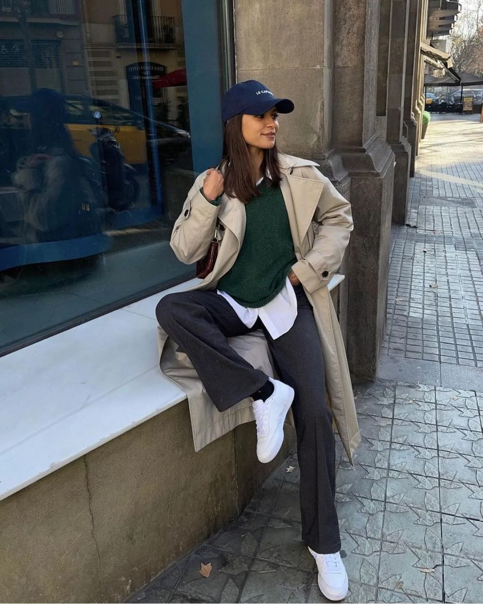 #2. Φόρεσε το tailored παντελόνι σου με ένα πουκάμισο και καζάκα και ολοκλήρωσε το look με μια κομψή καπαρντίνα και λευκά sneakers.