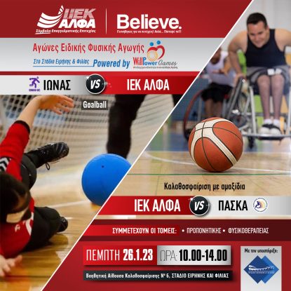 - Καλαθοσφαίριση με αμαξίδια, μεταξύ της ομάδας του ΙΕΚ ΑΛΦΑ και του Πανελλήνιου Αθλητικού Συλλόγου Κινητικά Αναπήρων (Π.Α.Σ.Κ.Α.)