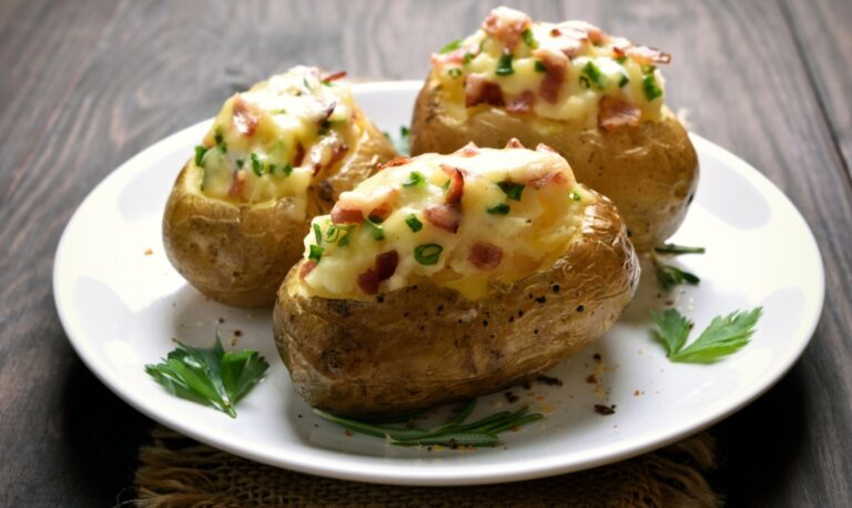 - Σοτάρετε σε αντικολλητικό τηγανάκι το μπέικον ή το ζαμπόν μαζί με το κρεμμυδάκι στο βούτυρο που απέμεινε. Περιχύνετε τις ζεστές πατάτες με τη σάλτσα του τυριού, μοιράζετε το μπέικον ή το ζαμπόν με το κρεμμυδάκι, πασπαλίζετε με λίγο άνηθο (ή άλλο φρέσκο μυρωδικό) και σερβίρετε αμέσως.
