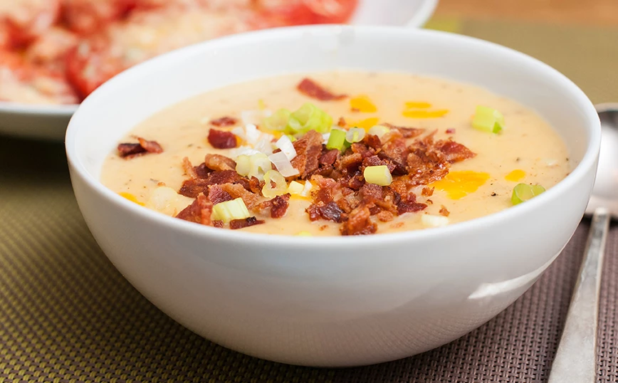 Σερβίρετε με τριμμένο τυρί, μπέικον και ψιλοκομμένα κρεμμυδάκια.