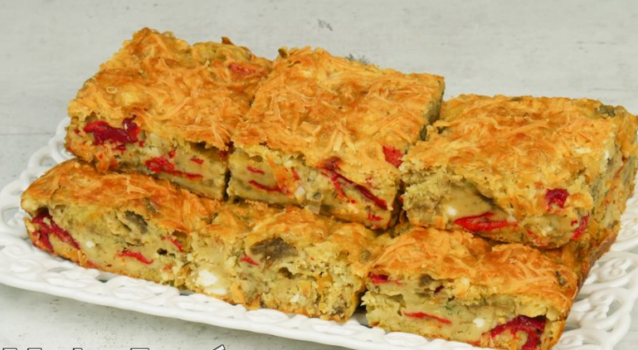 - Αδειάζετε το μείγμα σε ένα ταψί 34×27 εκ. στρωμένο με λαδόκολα, το απλώνετε ομοιόμορφα σε όλη την επιφάνεια του ταψιού και το πασπαλίζετε με το τριμμένο κεφαλοτύρι.