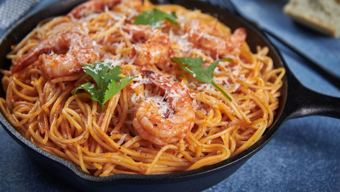 Βράζετε σε αλατισμένο νερό τα ζυμαρικά και τα σουρώνετε. Σε ένα τηγάνι, σοτάρετε στο ελαιόλαδο τις γαρίδες καθαρισμένες και προσθέτετε τις ντομάτες, το κρεμμύδι, τις πιπεριές ψιλοκομμένα και τα μυρωδικά. Σβήνετε με το κρασί και μετά από 5΄ ρίχνετε τα ζυμαρικά. Ανακατεύετε, αφήνετε τα ζυμαρικά να τραβήξουν τα υγρά και σερβίρετε.