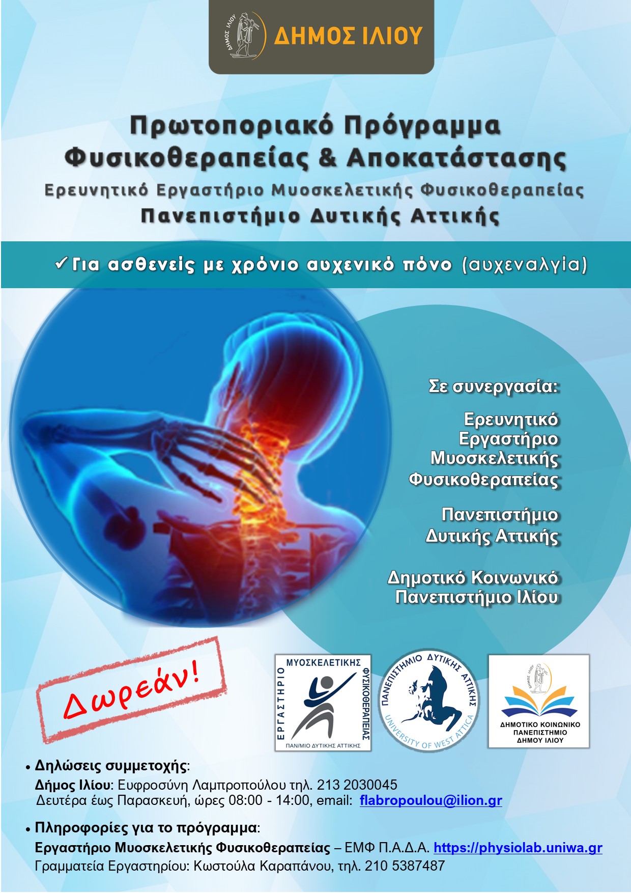 Παρατείνεται έως το τέλος Απριλίου, μετά την επιτυχημένη πορεία του, το πρωτοποριακό πρόγραμμα φυσικοθεραπείας και αποκατάστασης που έθεσαν σε εφαρμογή ο Δήμος Ιλίου, το Πανεπιστήμιο Δυτικής Αττικής (ΠΑΔΑ) και το Ερευνητικό Εργαστήριο Μυοσκελετικής Φυσικοθεραπείας του ΠΑΔΑ. Έως σήμερα 300 ασθενείς πολίτες βρήκαν ανακούφιση από τον πόνο μέσω εξατομικευμένου προγράμματος θεραπευτικής άσκησης, με δωρεάν υπηρεσίες φυσικοθεραπείας και αποκατάστασης.