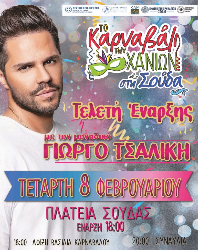 Αντίστροφη μέτρηση και για την Τελετή Έναρξης του Καρναβαλιού, η οποία θα πραγματοποιηθεί την Τετάρτη 8 Φεβρουαρίου, στις 18.00, στην πλατεία Σούδας, με τον Βασιλιά Καρνάβαλο να κάνει την εμφάνιση του, ενώ θα ακολουθήσει μεγάλη, ξέφρενη συναυλία με τον Γιώργο Τσαλίκη, στις 20:00.