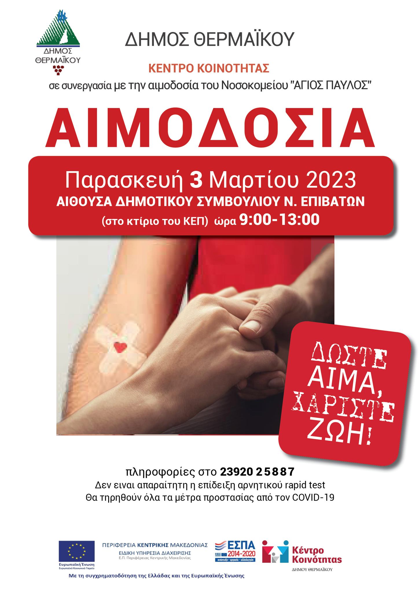 Έκτακτη εθελοντική αιμοδοσία οργανώνει το Κέντρο Κοινότητας του Δ. Θερμαϊκού σε συνεργασία με το Γ.Ν.Θ «Άγιος Παύλος». Οι εθελοντές αιμοδότες μπορούν να προσέλθουν στην Αίθουσα Δημοτικού Συμβουλίου (κτίριο ΚΕΠ), στους Νέους Επιβάτες, την Παρασκευή 03/03 και ώρες 09:00π.μ – 13:00μ.μ.