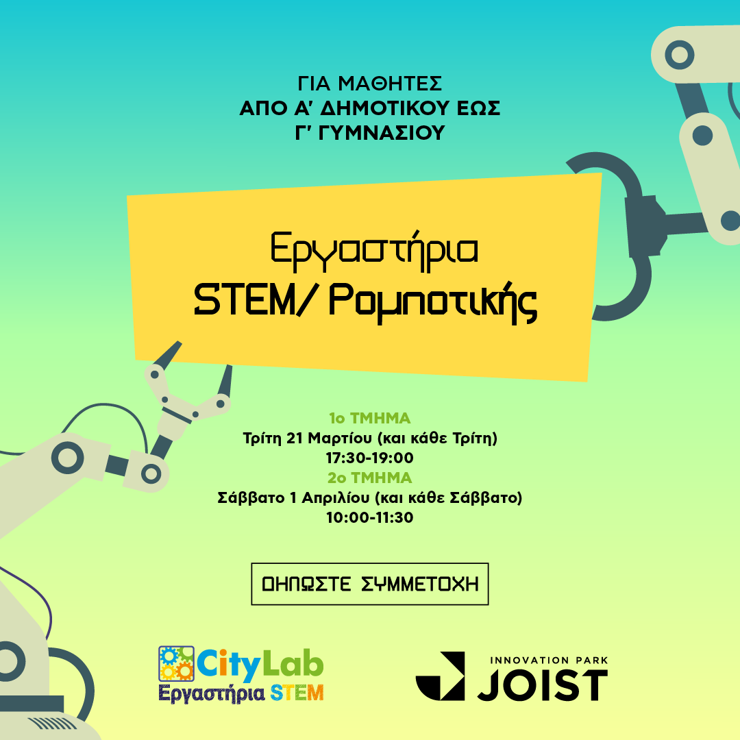 Με χαρά ανακοινώνουμε τη συνεργασία του Πάρκου Καινοτομίας JOIST με την εταιρία CityLab στις εγκαταστάσεις μας στη Λάρισα και σας προσκαλούμε στα εργαστήρια STEM/ρομποτικής για μαθητές από Α’ Δημοτικού έως Γ’ Γυμνασίου!