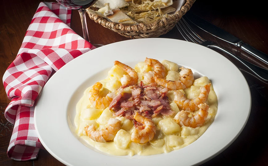 Προσθέστε τις γαρίδες και τα νιόκι και ανακατέψτε απαλά.