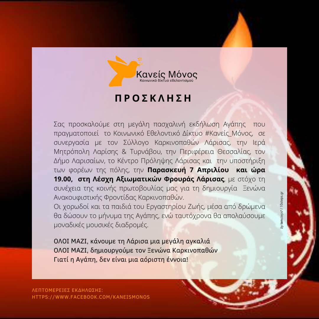Με πρωτοβουλία του Κοινωνικού Εθελοντικού Δικτύου #Κανείς Μόνος» και συνδιοργανωτές, την Ιερά Μητρόπολη Λαρίσης & Τυρνάβου, την Περιφέρεια Θεσσαλίας, τον Δήμο Λαρισαίων, τον Σύλλογο Καρκινοπαθών ν. Λάρισας και τη στήριξη των φορέων της πόλης, του Ιατρικού Συλλόγου Λάρισας, του Φαρμακευτικού Συλλόγου, του Δικηγορικού Συλλόγου , του Εμπορικού Συλλόγου, του Κέντρου Πρόληψης ΟΚΑΝΑ, των ΠΡΟΣΥΦΛΑ και ΣΟΦΛΑ, της Συντεχνίας Αρτοποιών Λάρισας θα πραγματοποιηθεί μια ξεχωριστή εκδήλωση Αλληλεγγύης, την Παρασκευή 7 Απριλίου από ώρα 10 πρωί μέχρι 22.00 το βράδυ στη Λέσχη Αξιωματικών Φρουράς Λάρισας, σε συνέχεια της μεγάλης Χριστουγεννιάτικης εκδήλωσης για την δημιουργία Ξενώνα Καρκινοπαθών στη Λάρισα.