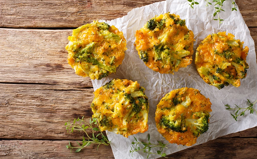 Επικαλύψτε μια φόρμα για μάφιν με 12 θήκες με σπρέι μαγειρικής. Μοιράστε ομοιόμορφα το μείγμα αυγών σε κάθε θήκη και πασπαλίστε με το υπόλοιπο τυρί τσένταρ. Ψήστε 18- 22 λεπτά, μέχρι να σταθεροποιηθούν τα αυγά.