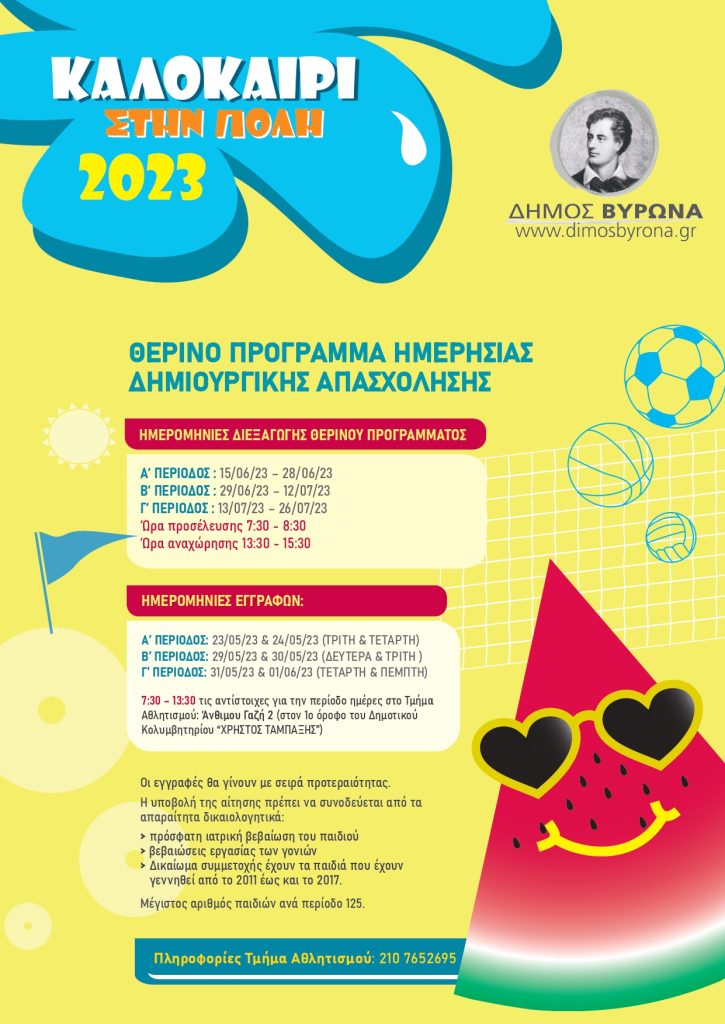 ΚεντρικήΚοινωνικά“Καλοκαίρι στην πόλη 2023” για τα παιδιά του Δήμου Βύρωνα by xristiana22 Μαΐου 202322 Μαΐου 20230556 Share00 22/5/2023 Πηγή: https://www.xtypos.gr