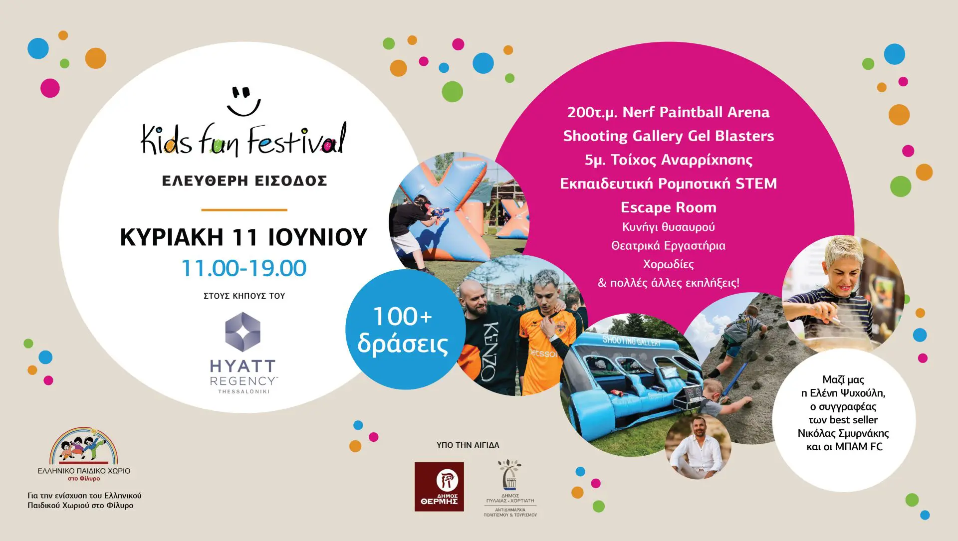 Το Kids Fun Festival, θα φιλοξενηθεί στους καταπράσινους κήπους του ξενοδοχείου Hyatt Regency Thessaloniki, από τις 11:00 μέχρι τις 19:00 και η είσοδος θα είναι ελεύθερη για όλους.
