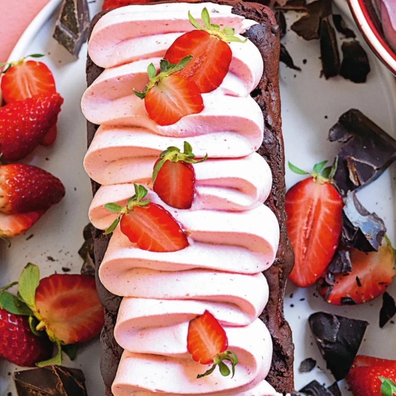 Χτυπάμε στο μίξερ τις υπόλοιπες φράουλες. Χτυπάμε εν μέρει την κρέμα γάλακτος και τη διπλώνουμε απαλά στις ανακατεμένες φράουλες. Βγάζουμε το κέικ από τον φούρνο, το αφήνουμε να κρυώσει απλώνουμε από πάνω τη μους φράουλας και σερβίρουμε κατά βούληση με φρέσκες φράουλες και ψιλοκομμένη μαύρη σοκολάτα.