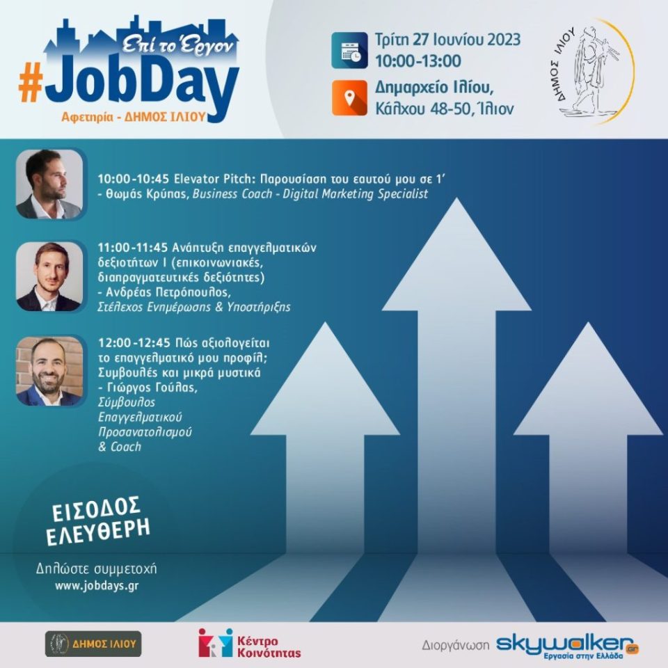 Το Κέντρο Κοινότητας του Δήμου Ιλίου σε συνεργασία με την ελληνική ιστοσελίδα skywalker.gr που δραστηριοποιείται στο χώρο αναζήτησης εργασίας, διοργανώνει τη δράση «Επί το έργον #JobDay Αφετηρία – Δήμος Ιλίου» την Τρίτη 27 Ιουνίου, στο Δημαρχείο Ιλίου από ώρα 10:00π.μ.
