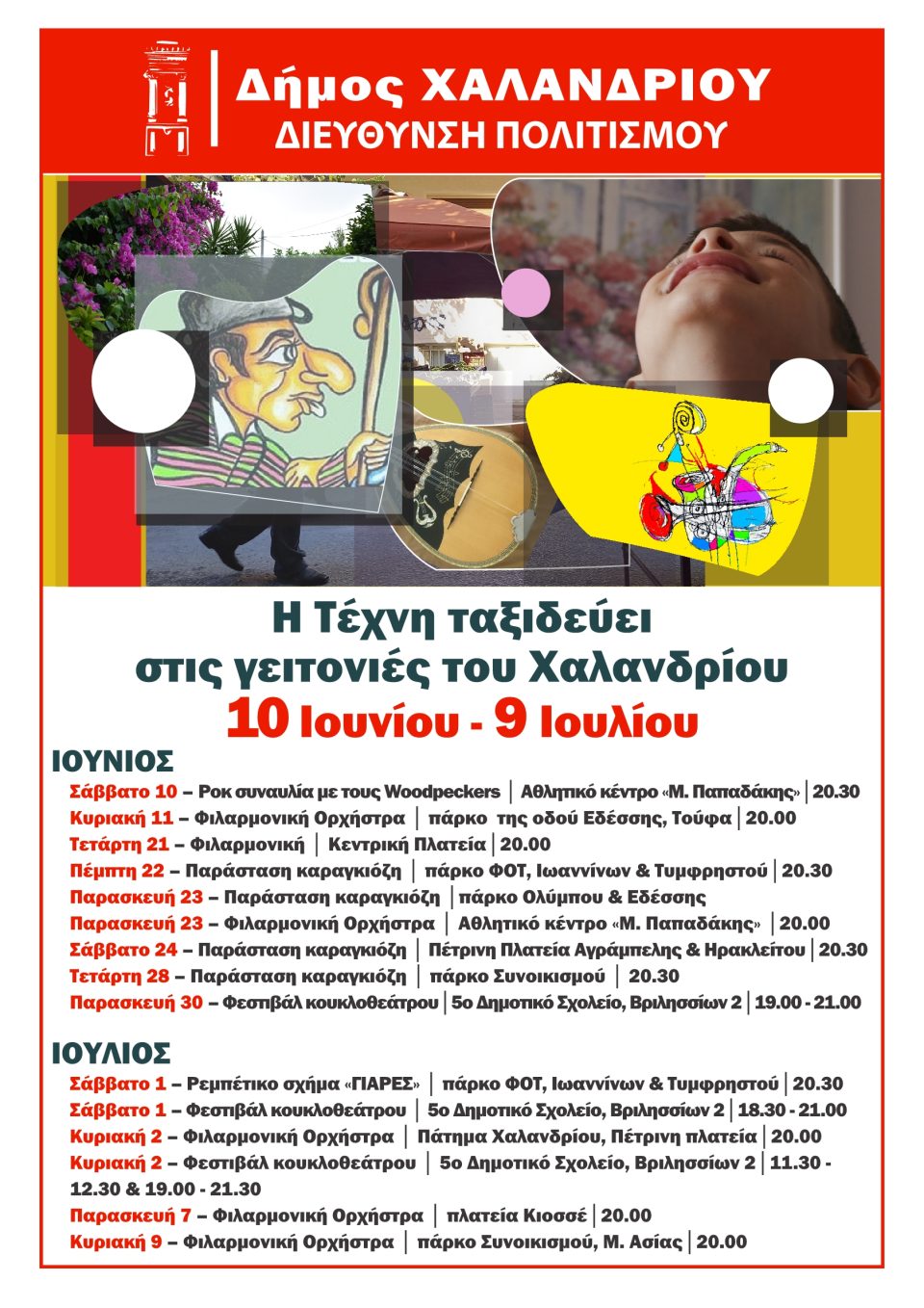 Το πρόγραμμα των πολιτιστικών δράσεων η «Τέχνη ταξιδεύει στις γειτονιές του Χαλανδρίου» αναμορφώθηκε εξαιτίας των εκδηλώσεων που αναβλήθηκαν, λόγω τριήμερου πένθους μετά το τραγικό ναυάγιο ανοιχτά της Πύλου.