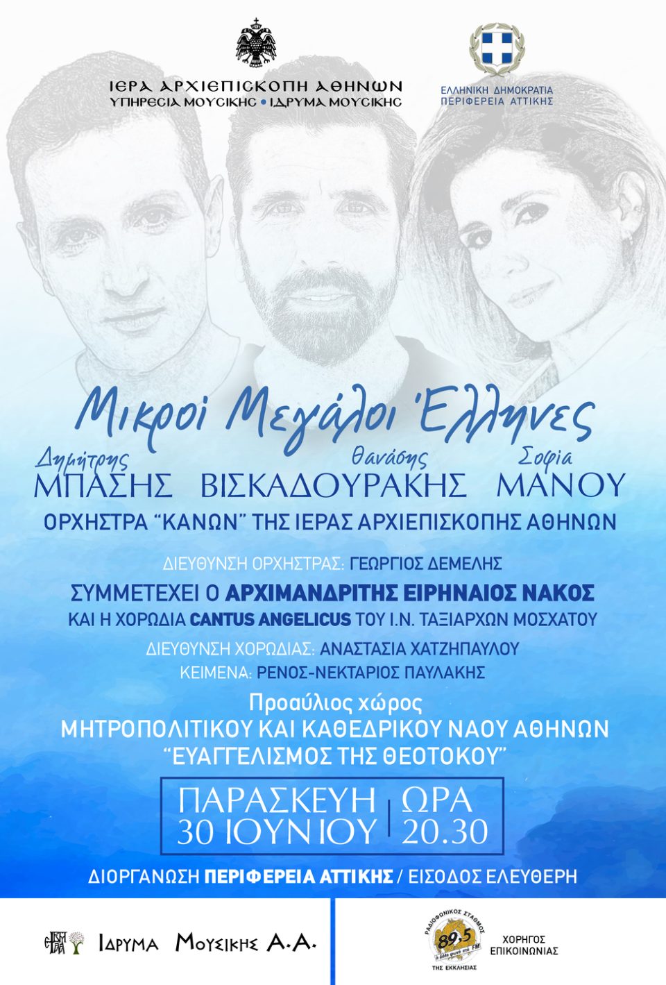 H Περιφέρεια Αττικής σε συνεργασία με την Υπηρεσία και το Ίδρυμα Μουσικής της Ιεράς Αρχιεπισκοπής Αθηνών, παρουσιάζουν την μουσική εκδήλωση με τον τίτλο: «Μικροί Μεγάλοι Έλληνες», την Παρασκευή 30 Ιουνίου στον προαύλιο χώρο του Μητροπολιτικού και Καθεδρικού Ναού των Αθηνών, «ΕΥΑΓΓΕΛΙΣΜΟΣ ΤΗΣ ΘΕΟΤΟΚΟΥ», πλατεία Μητροπόλεως Αθήνα και ώρα 20:30 μ.μ.
