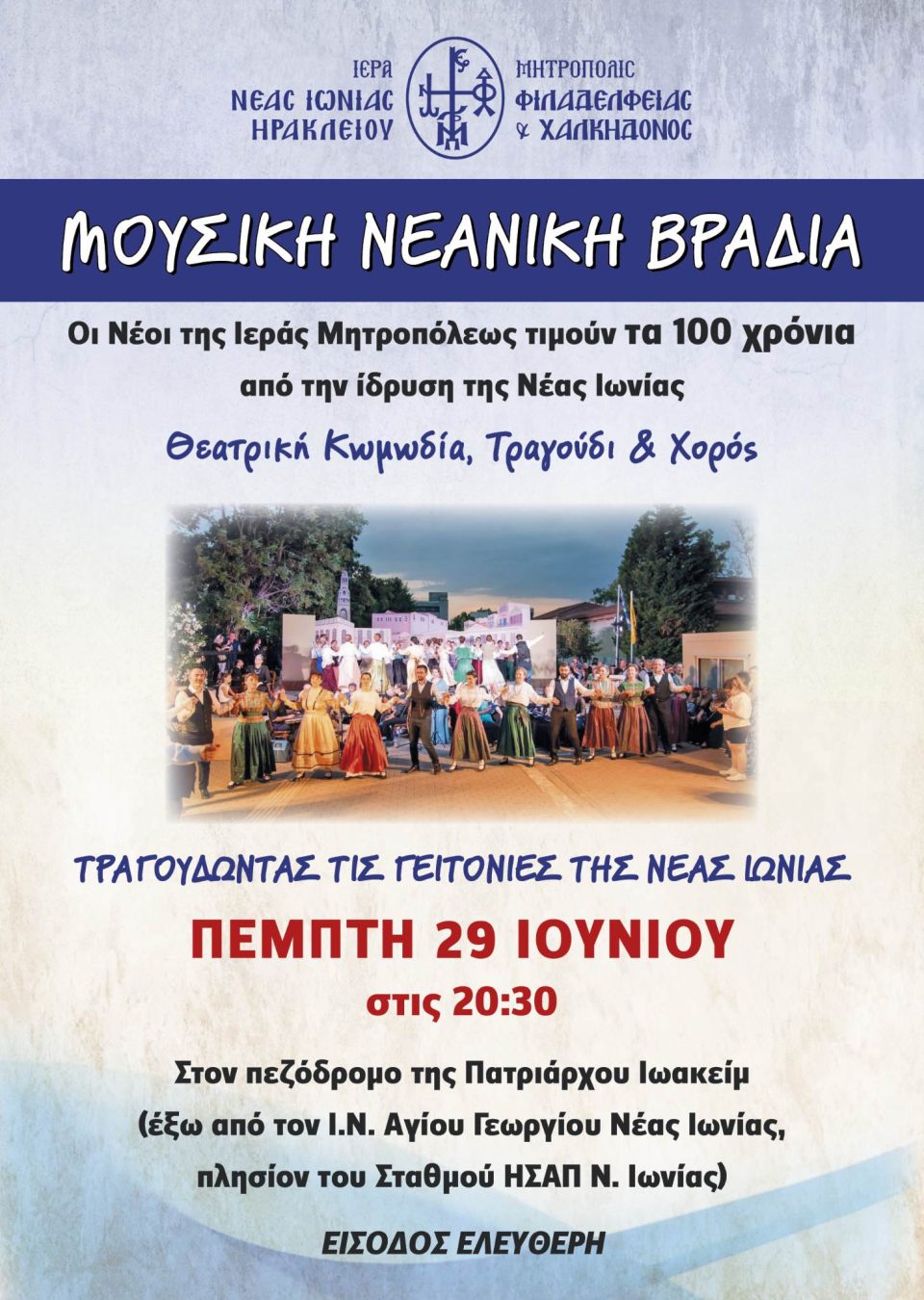 Με την αφορμή της συμπλήρωσης φέτος 100 ετών (1923-2023) από την ίδρυση της προσφυγουπόλεως Νεας Ιωνίας, η Ιερά Μητρόπολη Νέας Ιωνίας, Φιλαδελφείας, Ηρακλείου και Χαλκηδόνος διοργανώνει την Πέμπτη 29 Ιουνίου και ώρα 8:30μ.μ. στον πεζόδρομο της οδ.
