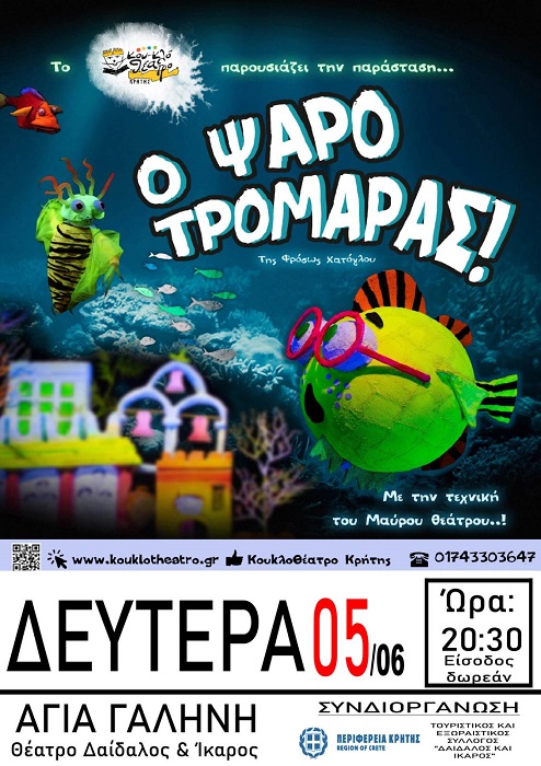 Ο Τουριστικός Εξωραϊστικός Σύλλογος «Δαίδαλος & Ίκαρος», σε συνδιοργάνωση με την Περιφέρεια Κρήτης προσκαλεί τα μικρά μας φιλαράκια, τη Δευτέρα 5 Ιουνίου (Αγίου Πνεύματος), στο θέατρο «Δαίδαλος & Ίκαρος», όπου θα απολαύσουν την ομάδα ΚουκλοΘέατρο Κρήτης/ Puppet Theatre of Crete να μας παρουσιάζει την παράσταση «Ο Ψαροτρομάρας».
