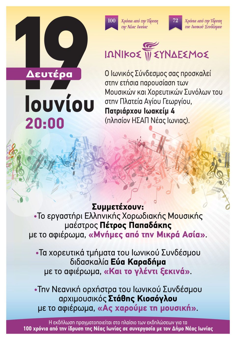 Ο Ιωνικός Σύνδεσμος σας προσκαλεί στην ετήσια παρουσίαση των Μουσικών και Χορευτικών Συνόλων του, την Δευτέρα, 19 Ιουνίου 2023 και ώρα 20.00, στην πλατεία Αγίου Γεωργίου, Πατριάρχου Ιωακείμ 4 (Πλησίον ΗΣΑΠ Νέας Ιωνίας).