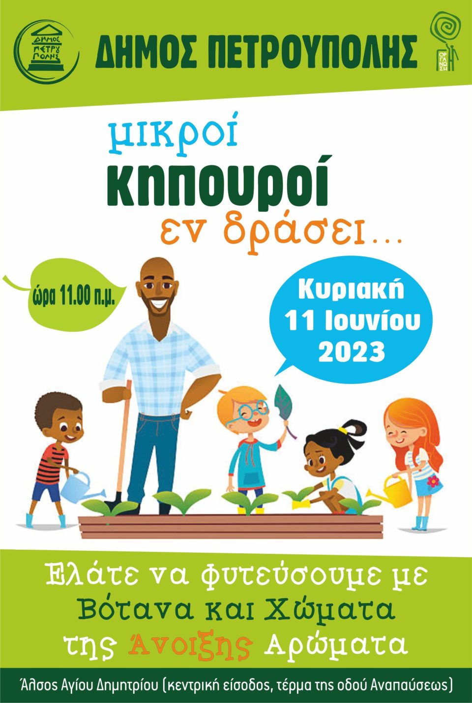Επίσης, την Κυριακή 11 Ιουνίου 2023 κατά τις ώρες 11:00-13:00, σε συνεργασία με την Οργάνωση Γη, θα πραγματοποιηθεί εντός του Άλσους Αγίου Δημητρίου, ένα Υπαίθριο Εργαστήριο Κηπουρικής με τίτλο «Μικροί κηπουροί εν δράσει!», για τα παιδιά (ηλικίας 4-13 ετών) της πόλης μας.