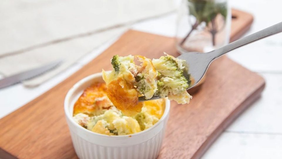Συνδυάστε το μπρόκολο, τα αυγά, τη μαγιονέζα και το κρεμμύδι σε ένα πυρέξ, καλύψτε με τη λευκή σάλτσα και ανακατέψτε καλά.