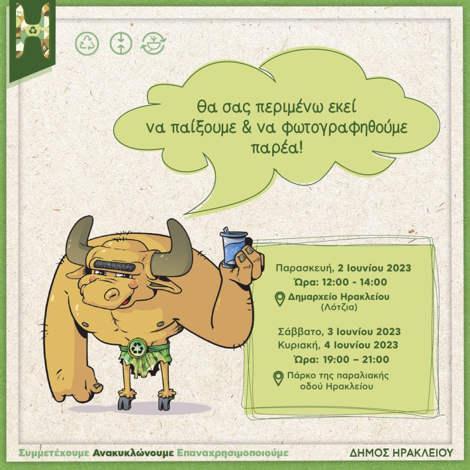 Στις 2 Ιουνίου από τις 12:00 έως τις 14:00 στο αίθριο της Λότζια και στις 3 και 4 Ιουνίου από τις 19:00 έως τις 21:00 στον Καράβολα, στο περίπτερο του Δήμου Ηρακλείου στο Φεστιβάλ, δίνει την ευκαιρία στους μικρούς και μεγάλους κατοίκους του Ηρακλείου να γνωρίσουν από κοντά τον ήρωα της Ανακύκλωσης.