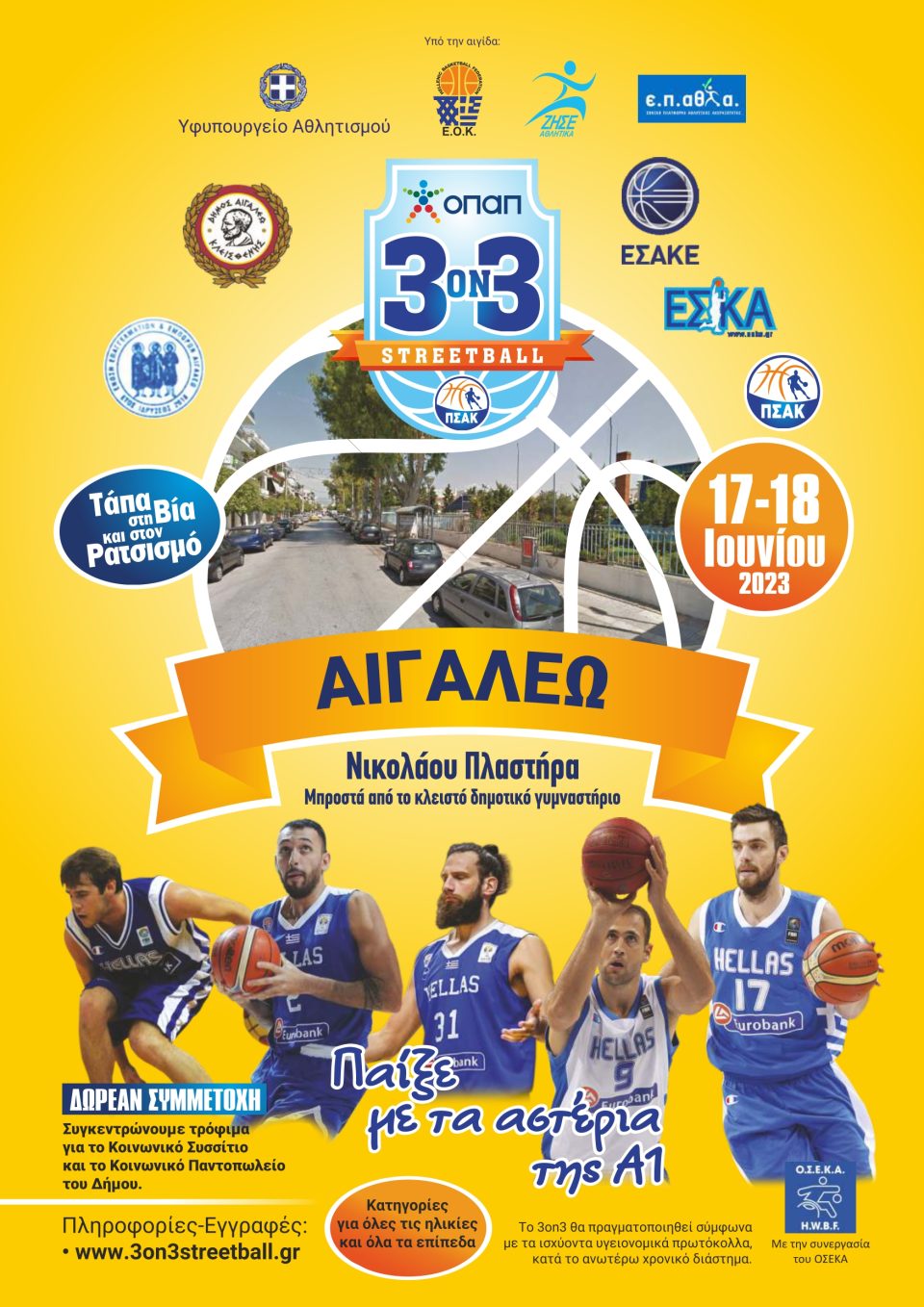Ο Δήμος Αιγάλεω, ο ΠΣΑΚΚ (Πανελλήνιος Σύνδεσμος Αμειβομένων Καλαθοσφαιριστών Καλαθοσφαιριστριών) και ο ΕΣΑΚΕ (Ελληνικός Σύνδεσμος Ανωνύμων Καλαθοσφαιρικών Εταιρειών), διοργανώνουν το διήμερο 17 και 18 Ιουνίου, υπό την αιγίδα του Υφυπουργείου Αθλητισμού και της ΕΟΚ (Ελληνική Ομοσπονδία Καλαθοσφαίρισης), το τουρνουά «3on3 Streetball» με κεντρικό σύνθημα «Τάπα στη βία και στον ρατσισμό».