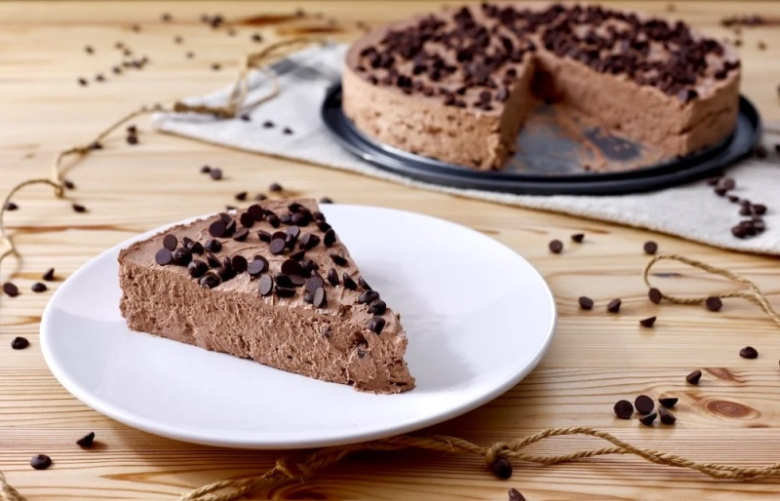 Τέλος, προσθέτουμε τα κομματάκια σοκολάτας, ανακατεύοντας με μια σπάτουλα και κάνοντας κινήσεις από κάτω προς τα πάνω για να κατανεμηθούν ομοιόμορφα. Ρίχνουμε και ισιώνουμε την κρέμα σε ένα ταψί, διακοσμούμε την επιφάνεια με μια χούφτα κομματάκια σοκολάτας και μετά βάζουμε το γλυκό στο ψυγείο για τουλάχιστον 4 ώρες.