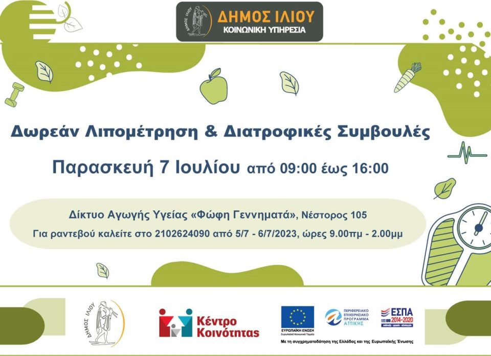 Ο Δήμος Ιλίου ενημερώνει ότι, η Διεύθυνση Κοινωνικής Προστασίας και Υγείας διοργανώνει δράση δωρεάν λιπομέτρησης και παροχής συμβουλών διατροφής με τον Κλινικό Διαιτολόγο/Διατροφολόγο κύριο Στέφανο Μαρκόπουλο, την Παρασκευή 7 Ιουλίου 2023 από 09:00 έως 16:00 στο χώρο του Δικτύου Αγωγής Υγείας «Φώφη Γεννηματά» (Νέστορος 105).