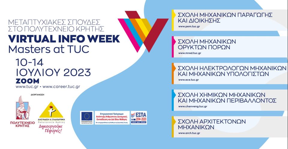 Το Γραφείο Διασύνδεσης και Σταδιοδρομίας του Πολυτεχνείου Κρήτης, στο πλαίσιο των δράσεων του, διοργανώνει Εβδομάδα Διαδικτυακών Παρουσιάσεων “Virtual Info Week Masters at TUC” για τα Προγράμματα Μεταπτυχιακών Σπουδών (ΠΜΣ) στο Πολυτεχνείο Κρήτης σε συνεργασία με τις πέντε Σχολές του Ιδρύματος. Οι παρουσιάσεις θα διεξαχθούν από 10 έως 14 Ιουλίου 2023 και ώρα 17:00-18:00 μέσω της πλατφόρμας τηλεδιασκέψεων ZOOM.